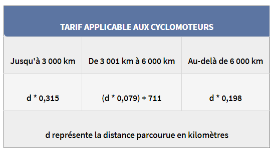 Barèmes applicables aux cyclomoteurs, vélomoteurs, scooters, motocyclettes (en €)